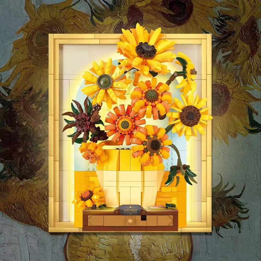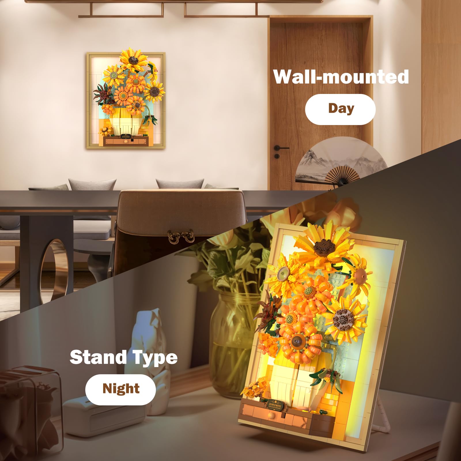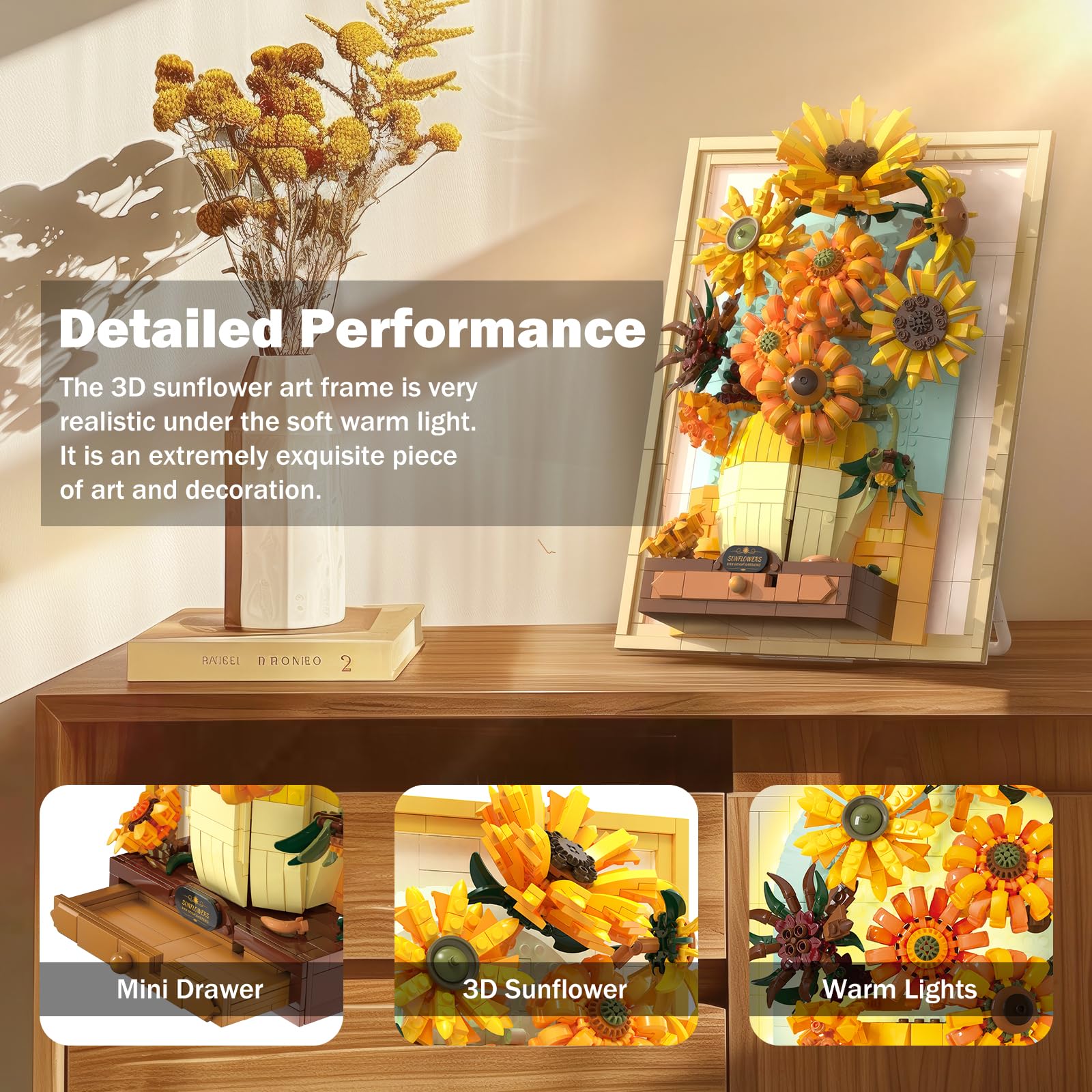 Sunflower Flower Set with Sensor Light, 3D Sunflower Van Gogh Painting Frame Wall Art Crafts (1166 Pcs)